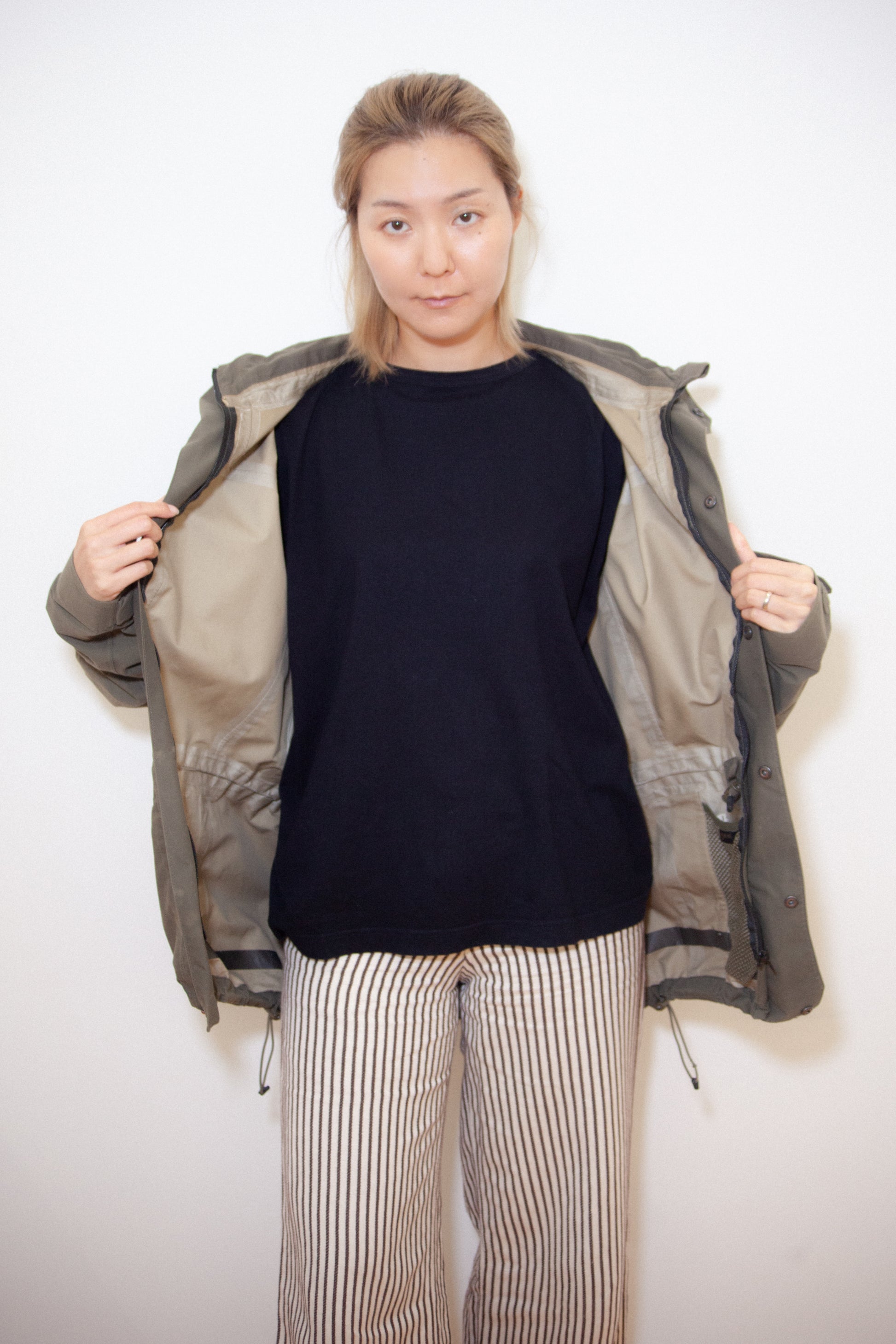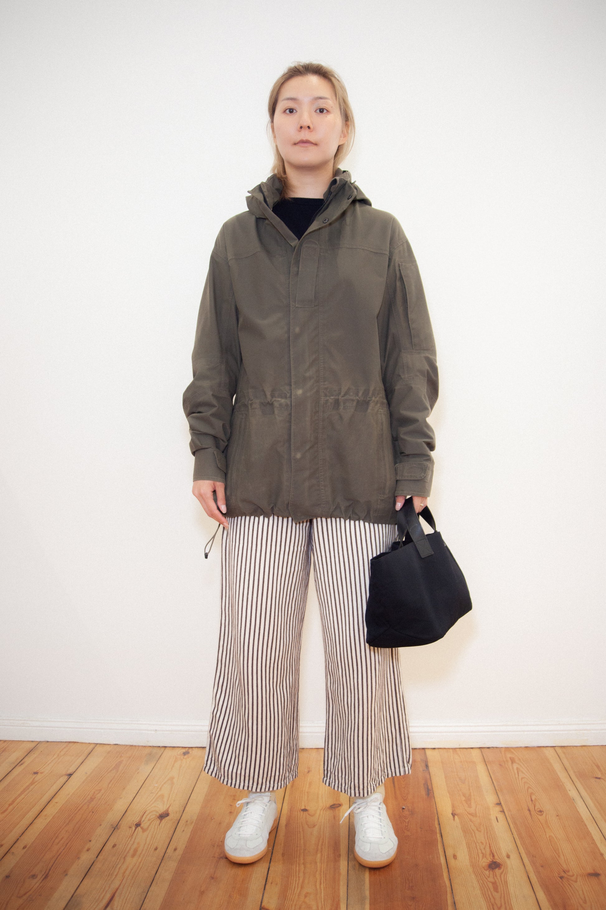 Features multiple pockets, adjustable hood, and waist drawcord for a functional, utilitarian silhouette.